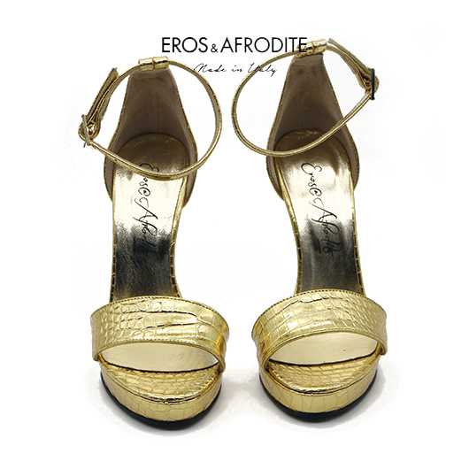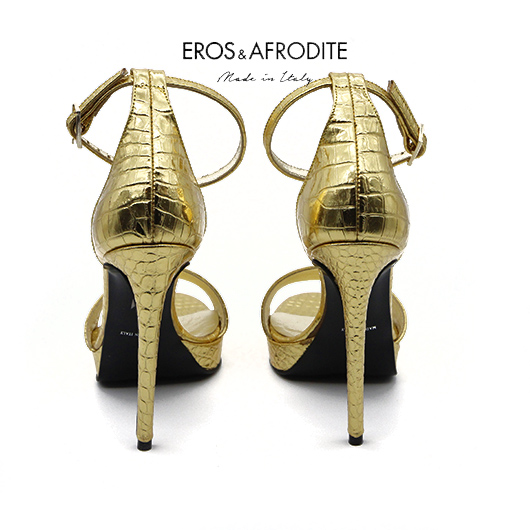 Sandalo Glamour realizzato in vera pelle colore oro, stampa cocco. Fodera interna in vera pelle laminata oro con soletta memory. Suola in cuoio verniciato nero. Tacco 12cm, plateau 2cm.
