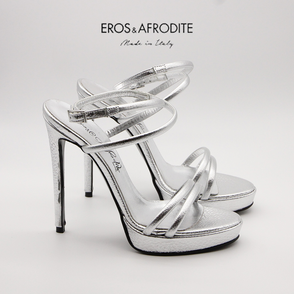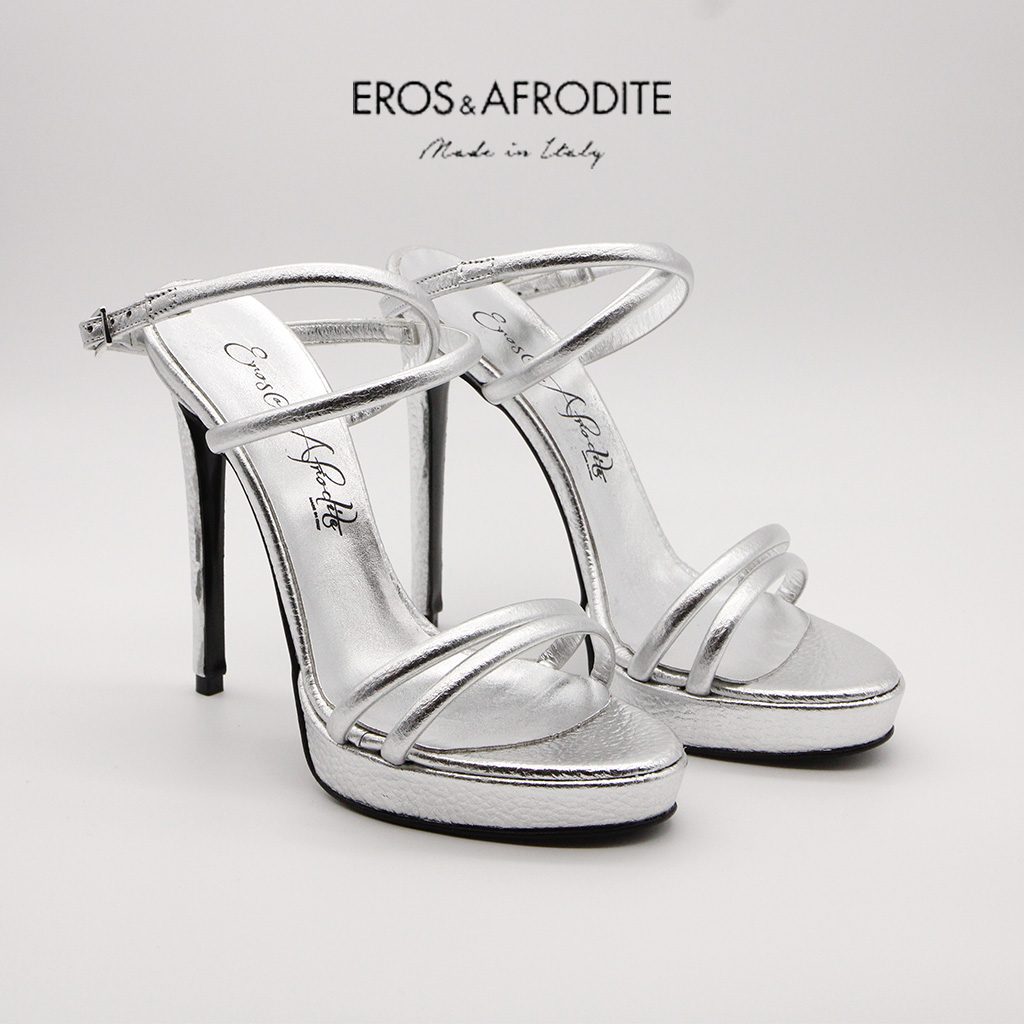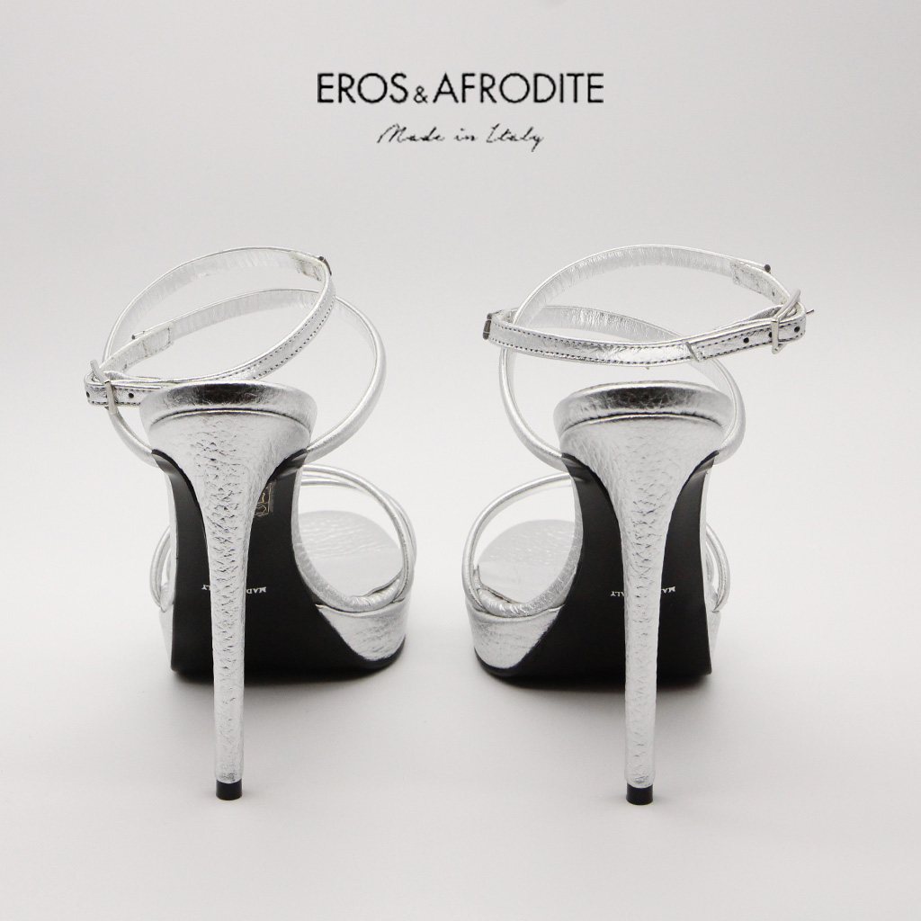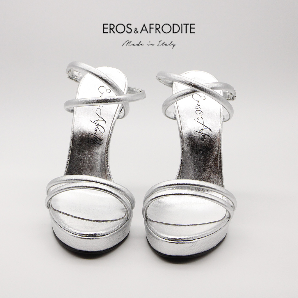 Sandalo Glamour realizzato in vera pelle colore argento. Lavorazione mignon, fodera in vera pelle laminata argento, soletta memory. Suola in cuoio verniciato nero, tacco 12, plateau 2cm.