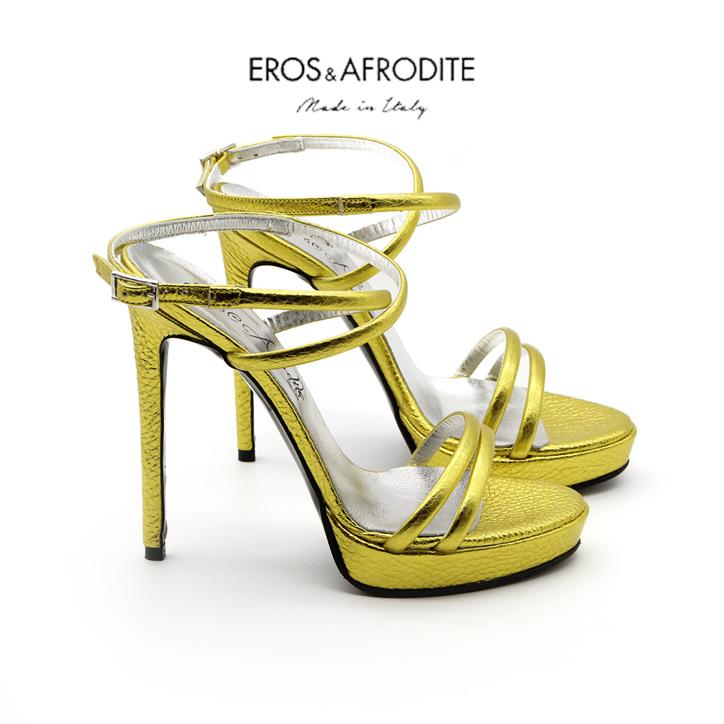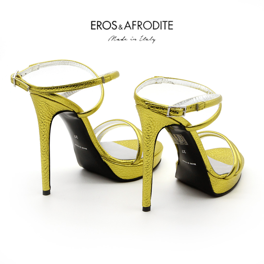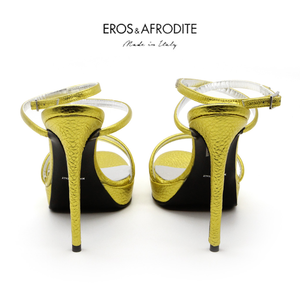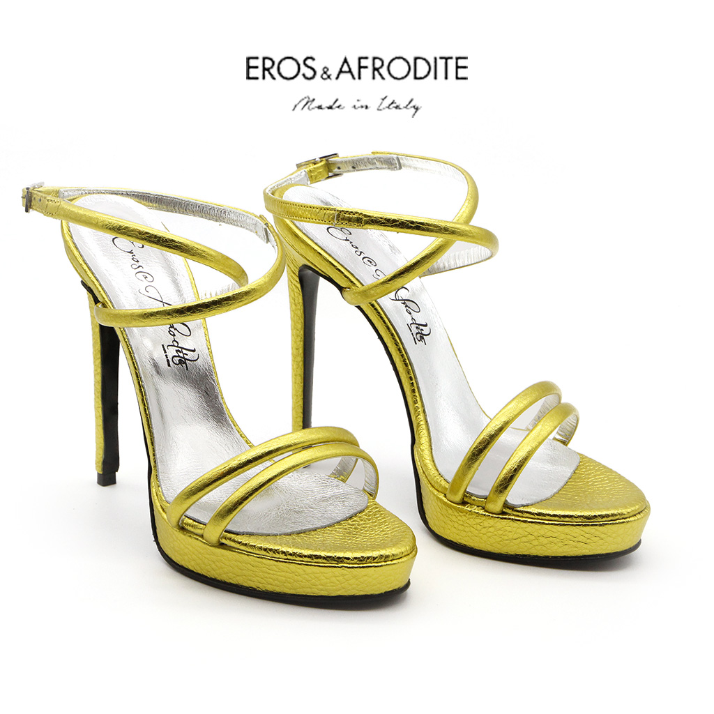 Sandalo glamour realizzato in vera pelle colore giallo laminato, lavorazione mignon. Fodera in vera pelle laminata argento. Soletta memory. Suola in cuoio verniciato nero, tacco 12cm, plateau 2cm.