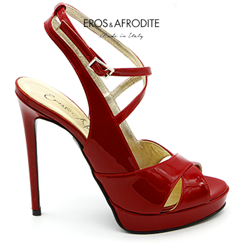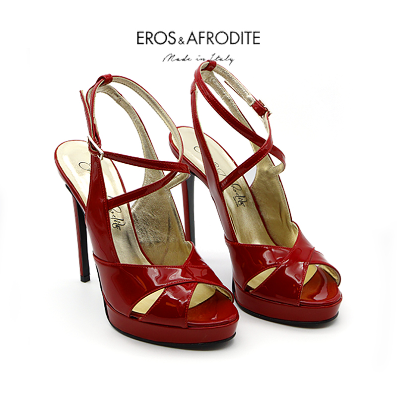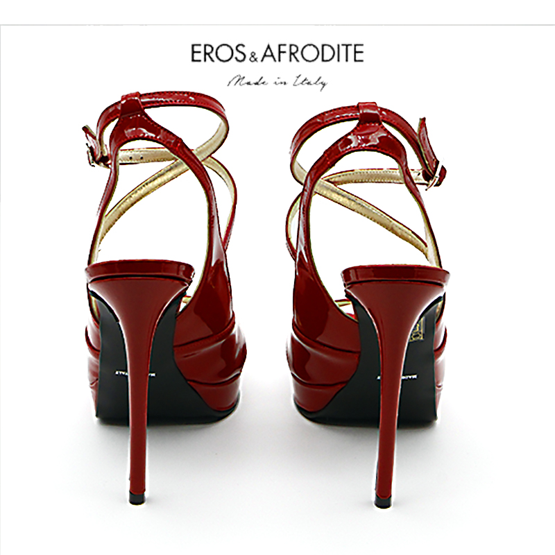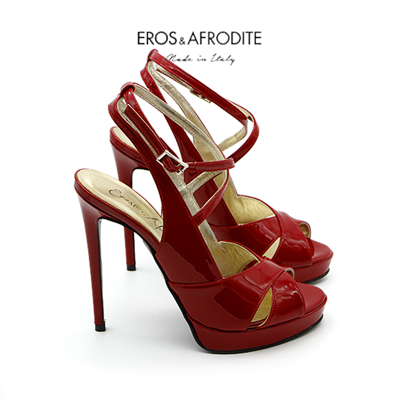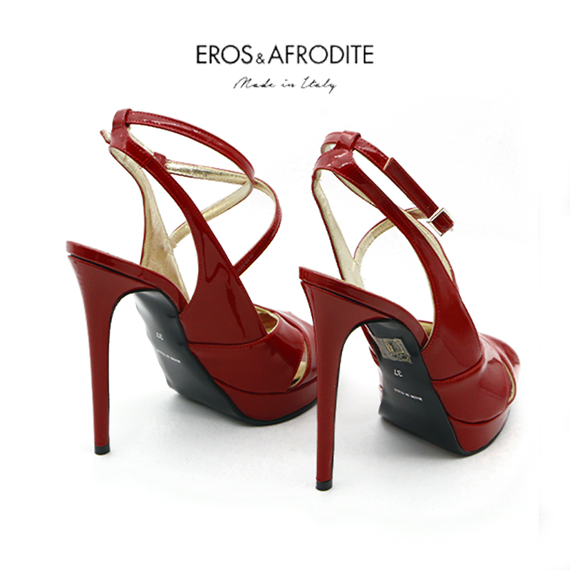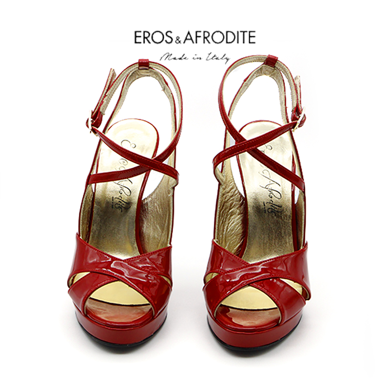 Sandalo glamour realizzato in vera pelle vernice rosso. Fodera in vera pelle laminato oro con soletta memory. Suola in vero cuoio verniciato nero. Tacco 12cm, plateau 2cm.