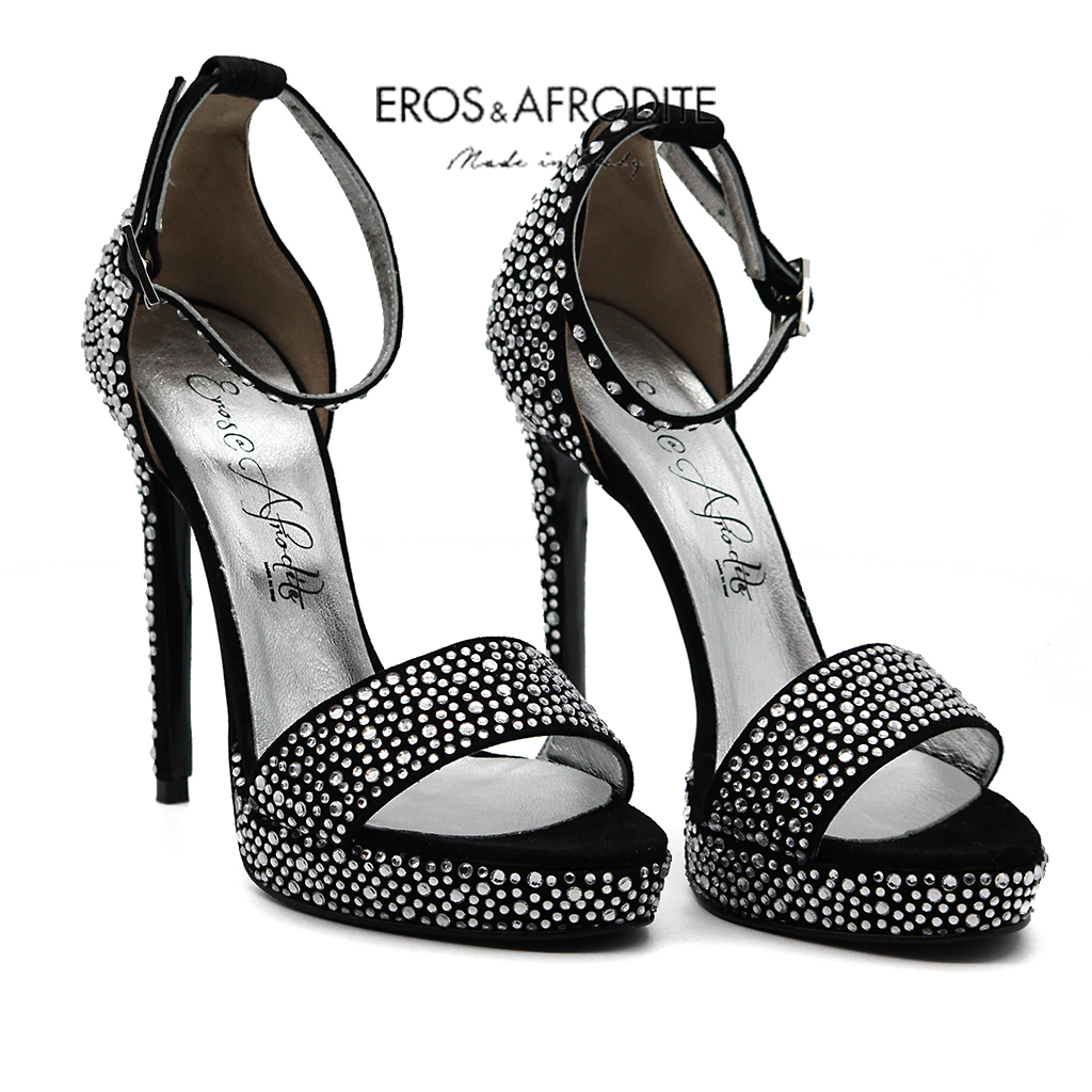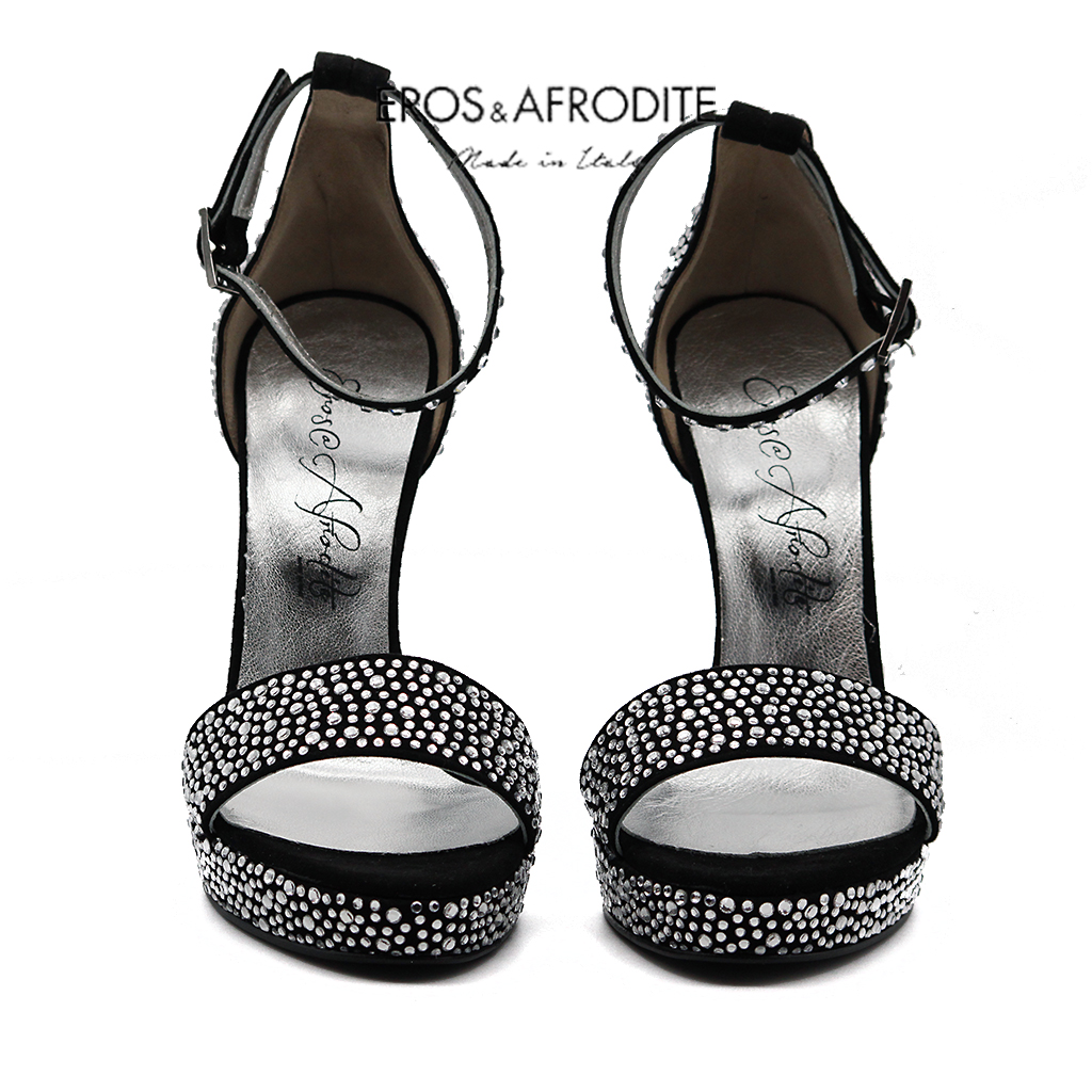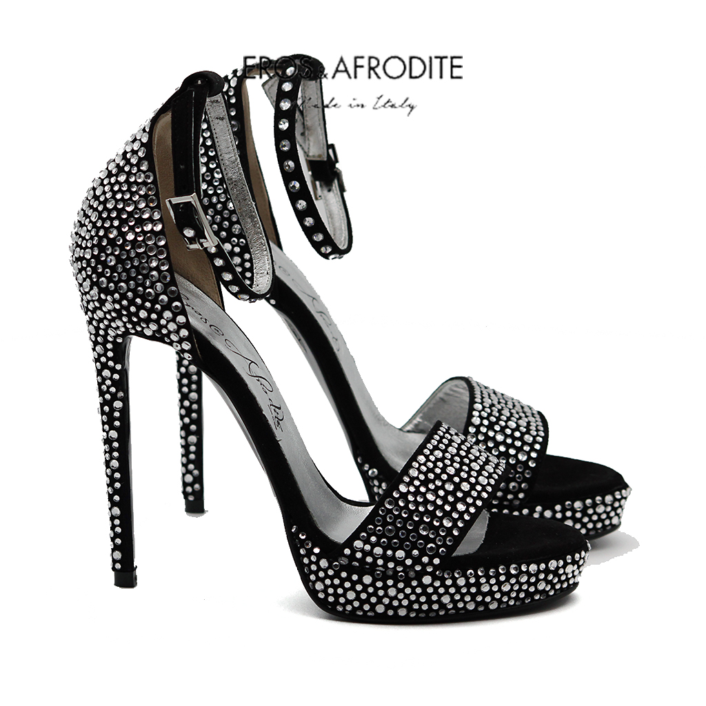 Sandalo glamour realizzato in vera pelle camoscio colore nero con strass. Fodera in vera pelle laminata argento con soletta memory. Suola in vero cuoio verniciato nero. Tacco 12, plateau 2cm.