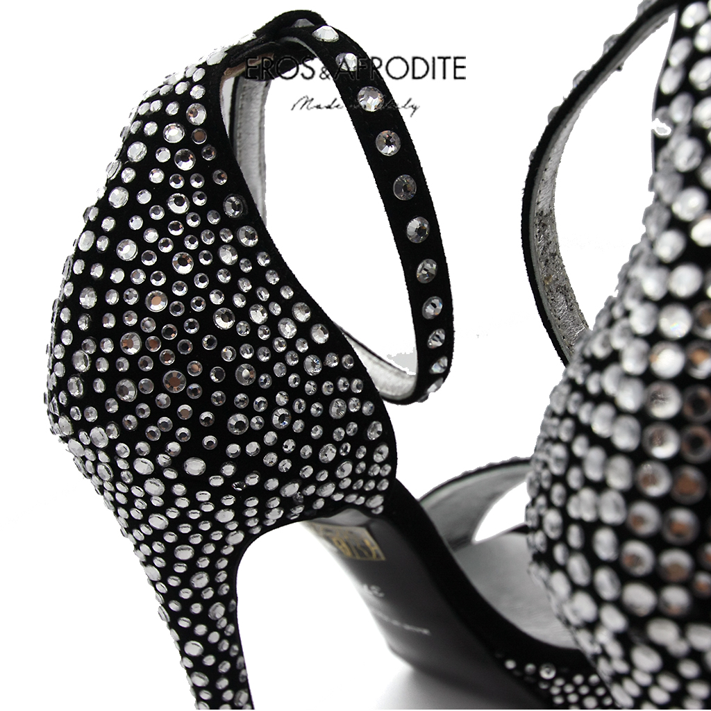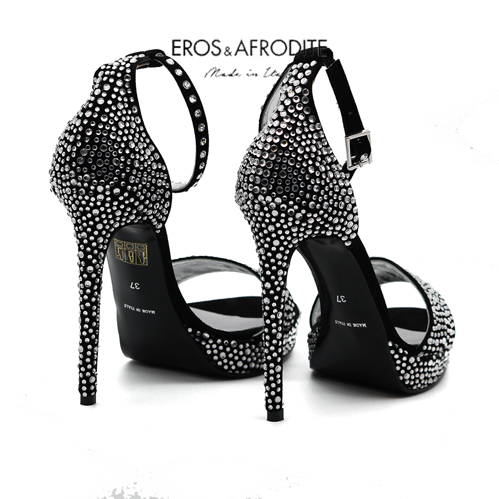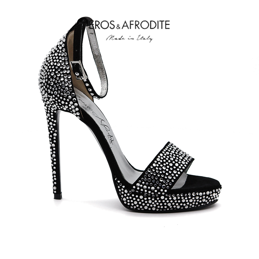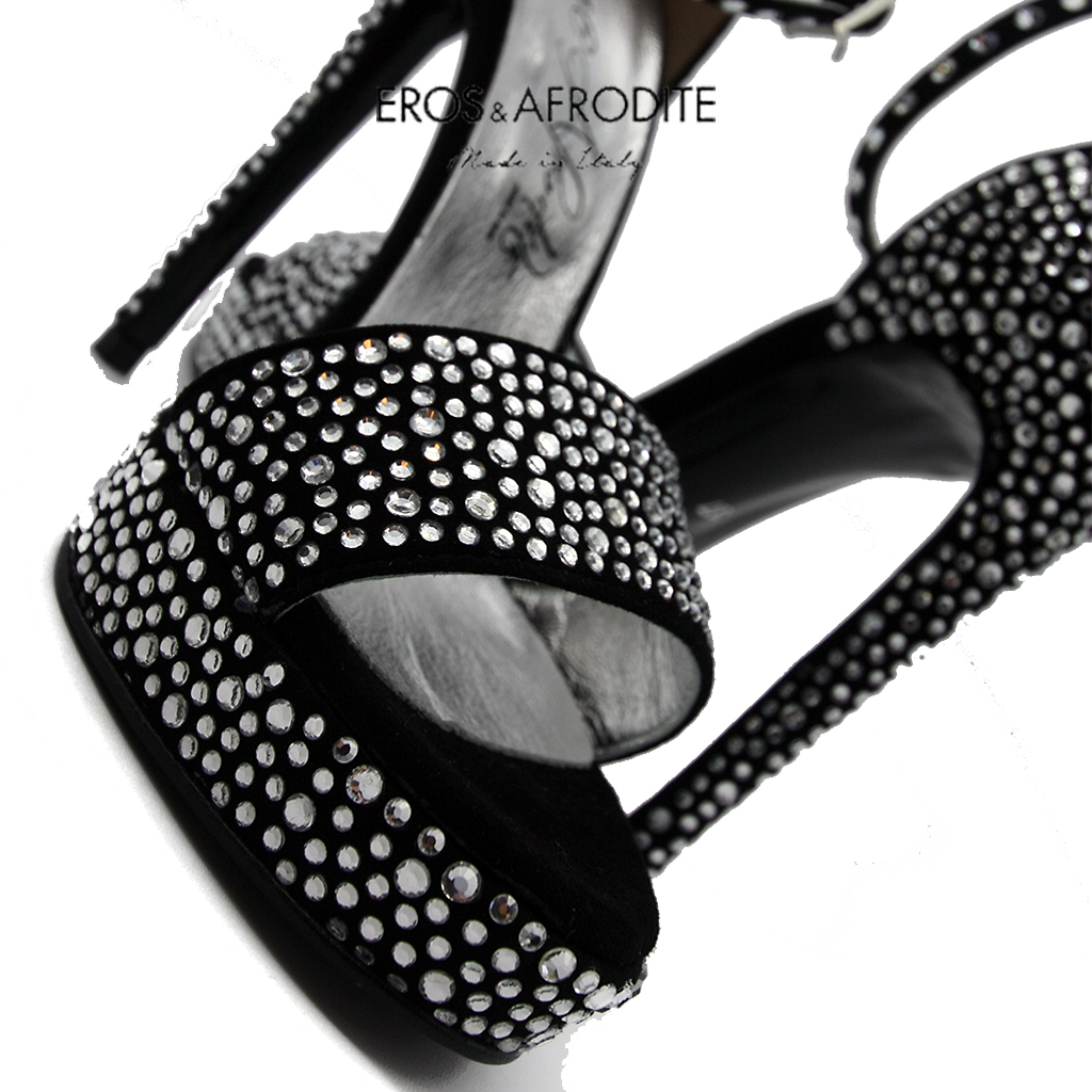 Sandalo glamour realizzato in vera pelle camoscio colore nero con strass. Fodera in vera pelle laminata argento con soletta memory. Suola in vero cuoio verniciato nero. Tacco 12, plateau 2cm.